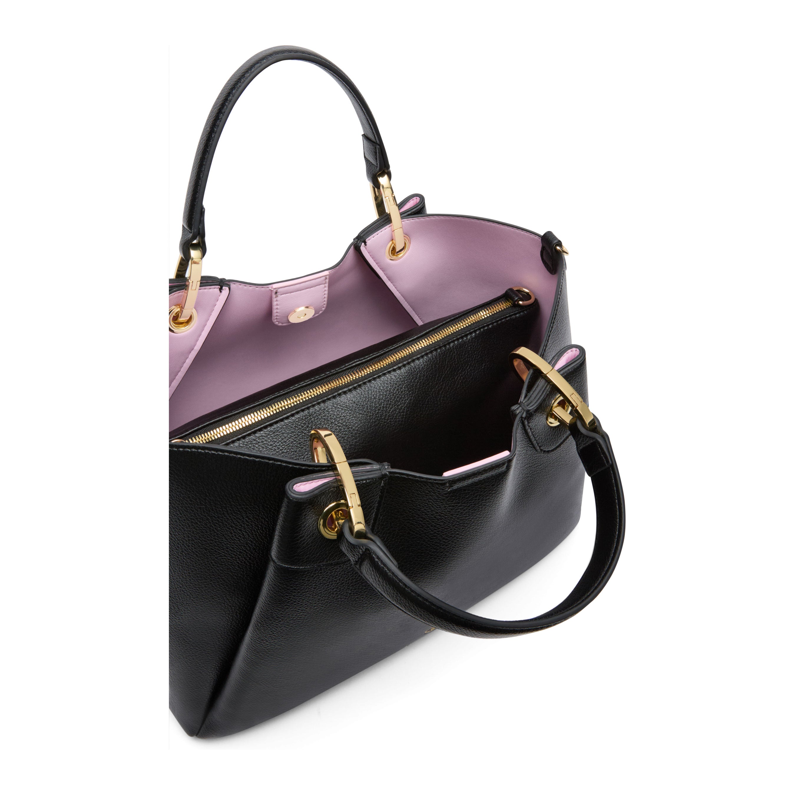 Le cuciture trasversali integrano pannelli espandibili, offrendo una maggiore capienza all'occorrenza. I doppi manici sono impreziositi da dettagli dorati, che conferiscono un tocco sofisticato al look.
