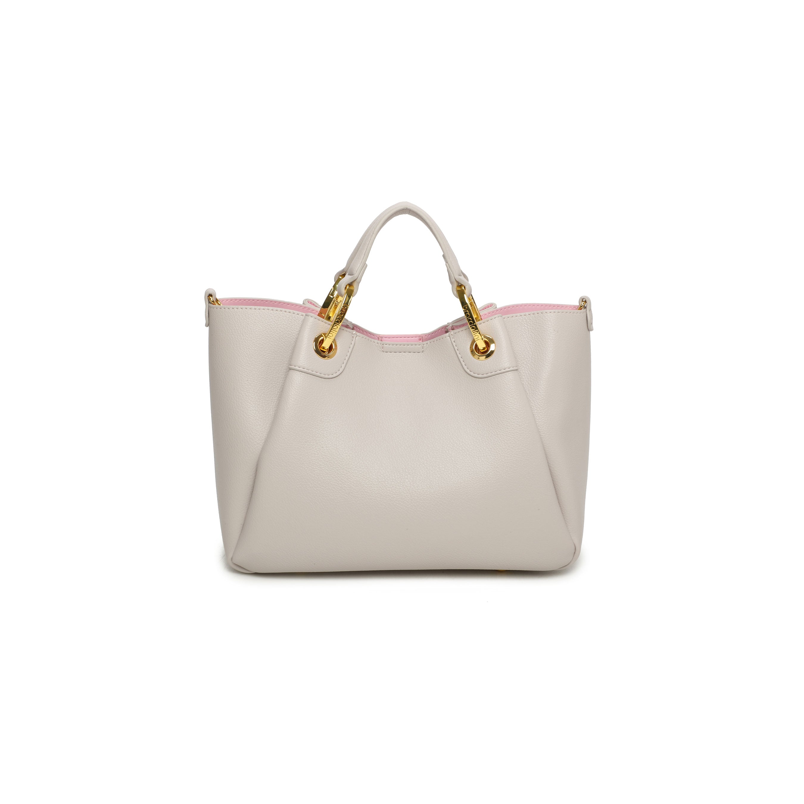 L'interno, rifinito con un elegante contrasto cromatico, dona originalità e stile. La borsa è dotata di una tracolla in nastro logato, regolabile e removibile, che consente di portarla comodamente a mano o a spalla.