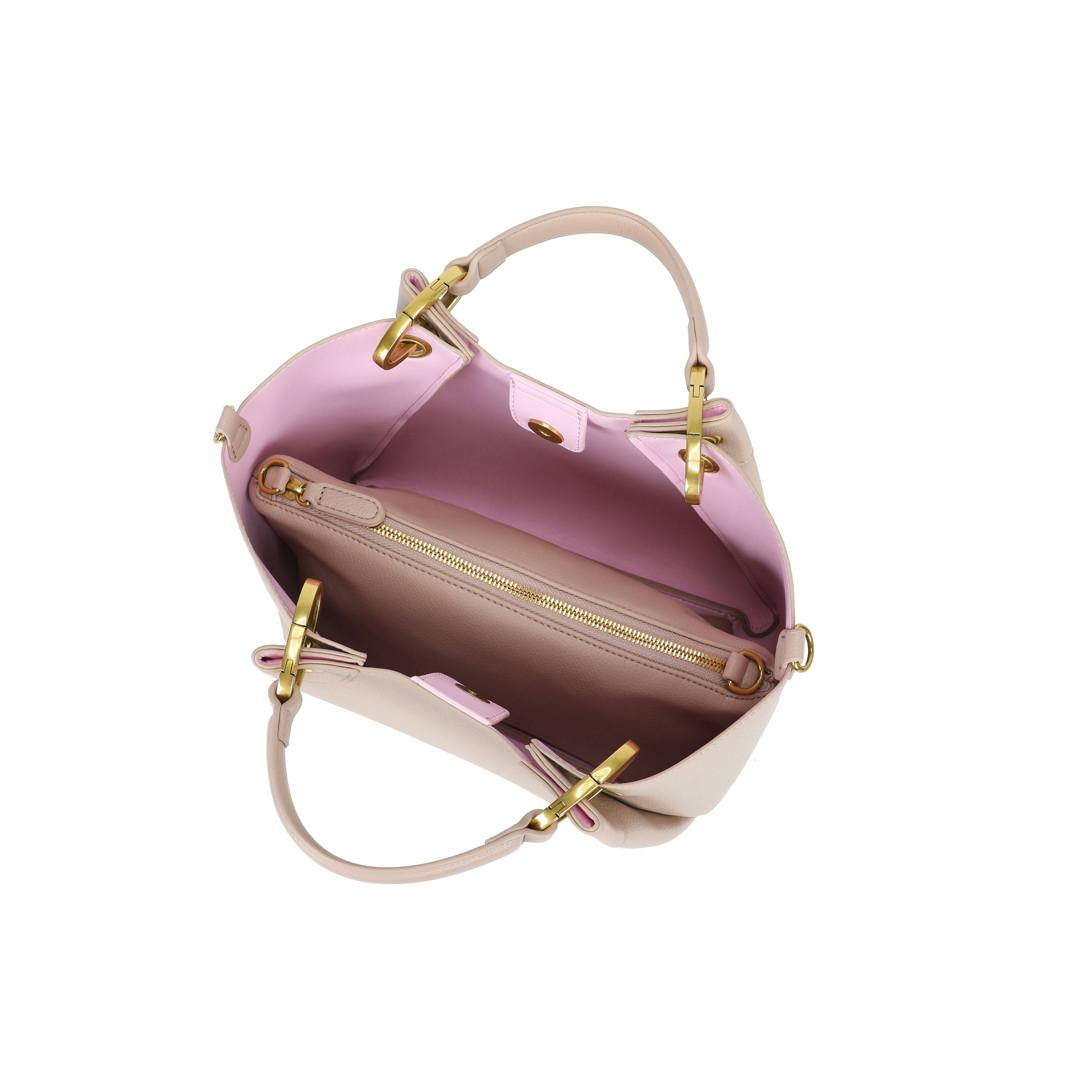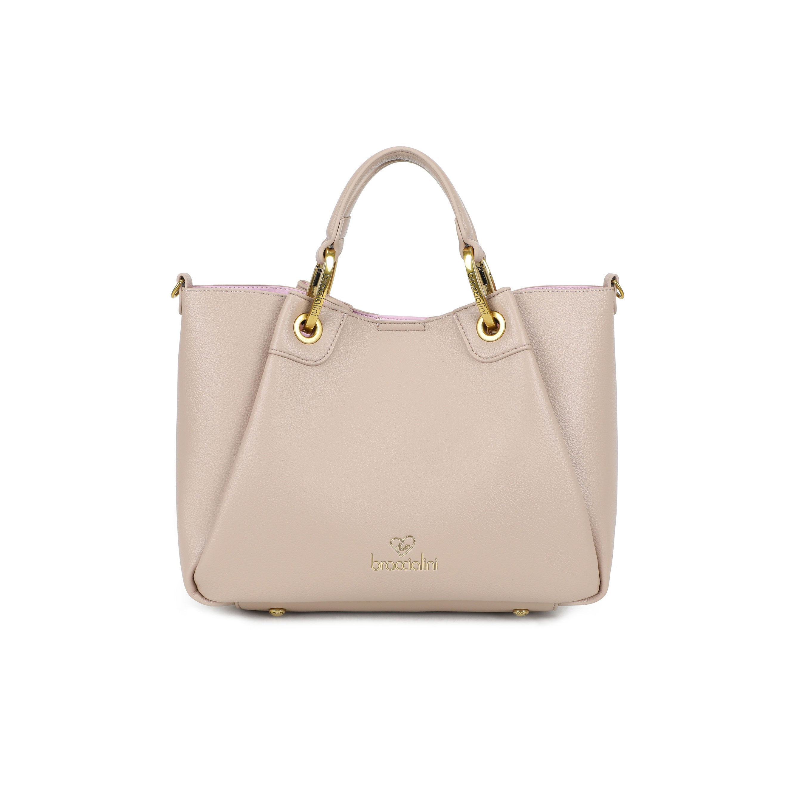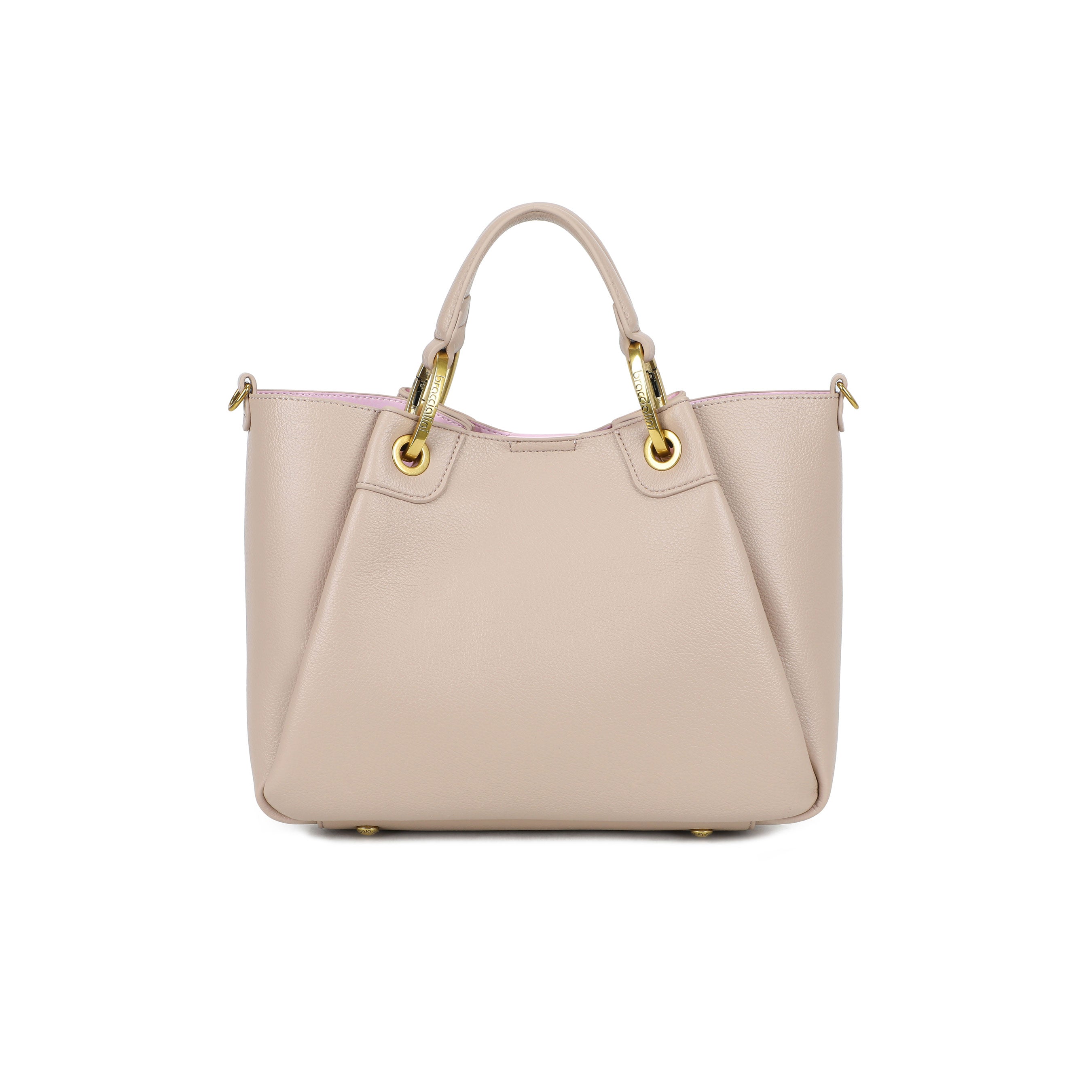 Questa borsa a mano di medie dimensioni combina design elegante e funzionalità quotidiana. I doppi manici con dettagli dorati aggiungono un tocco sofisticato, mentre i pannelli nascosti tra le cuciture trasversali consentono di ampliare la capienza in modo pratico e discreto.