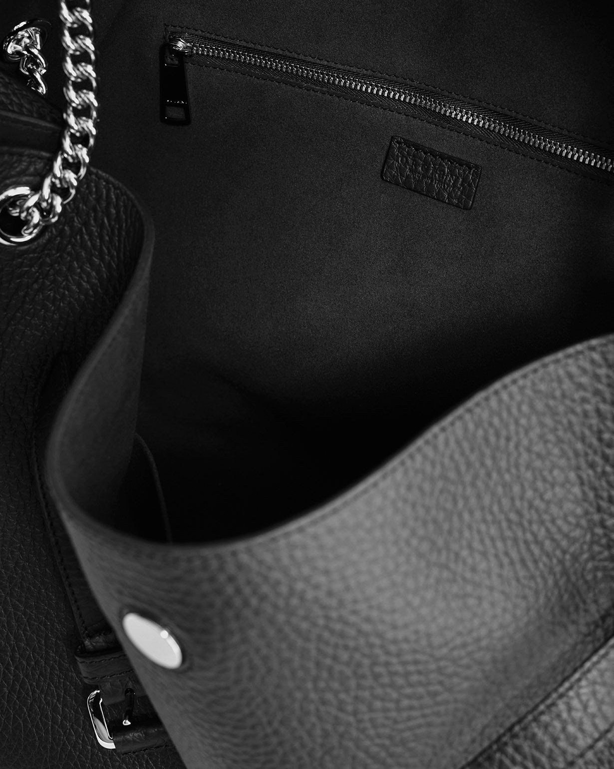 Il dettaglio della cintura slacciata, la forma allungata east-west e la tracolla a catena donano un tocco moderno, mentre i manici combinati in catena e pelle permettono di portarla comodamente a spalla. I tre taschini interni, di cui uno con zip, mantengono tutto organizzato, mentre la chiusura a patta con bottoni magnetici e fibbia aggiunge praticità ed eleganza.