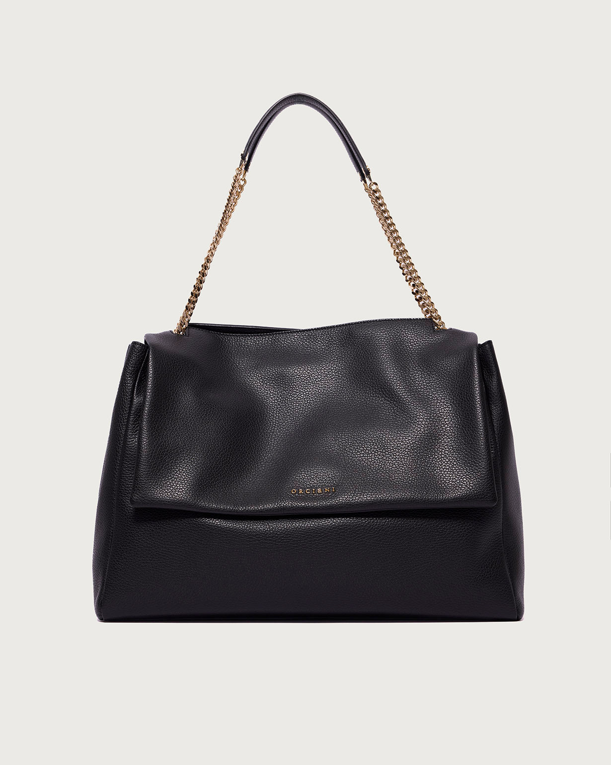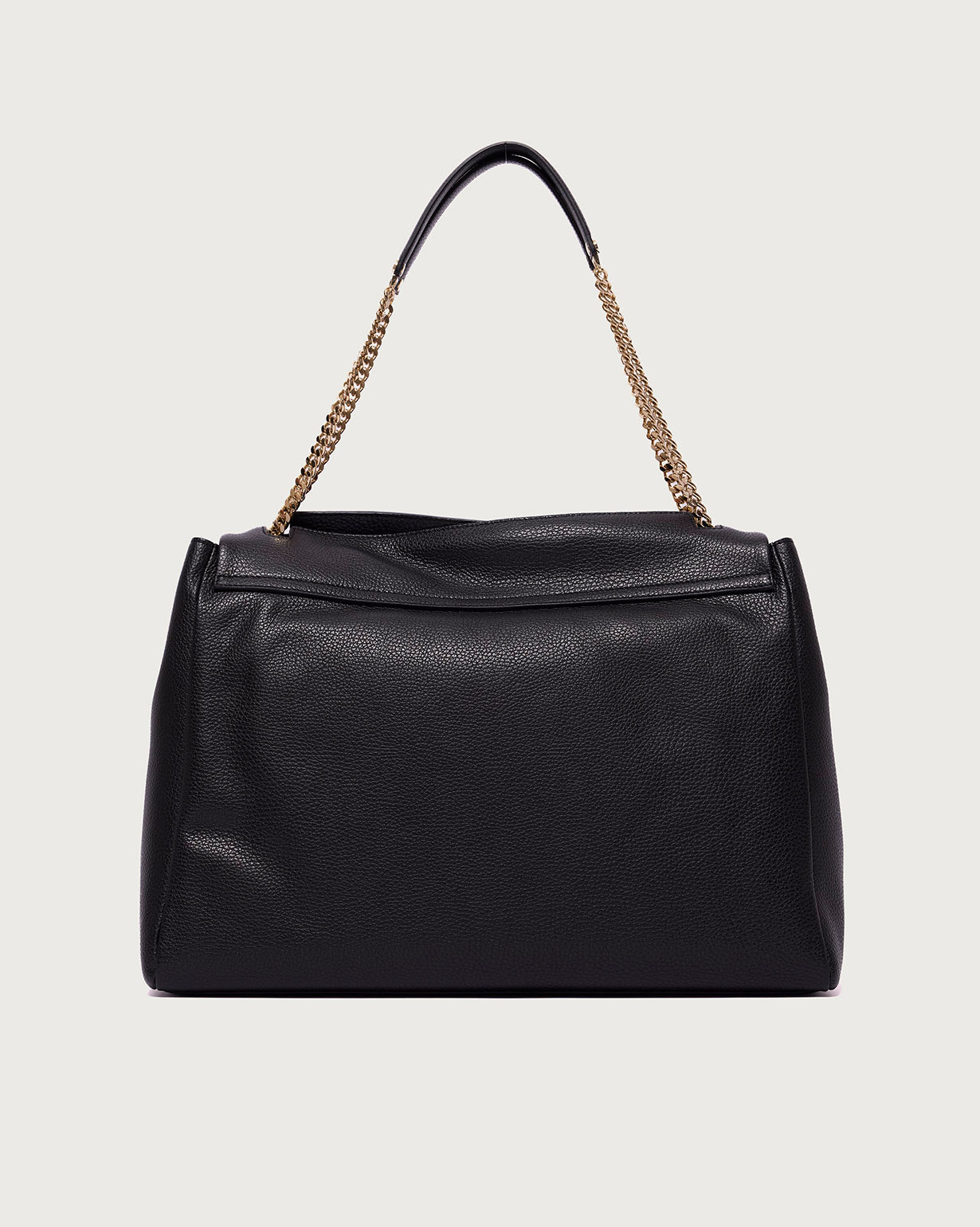 La Sveva Sense XL è la borsa a spalla ideale per chi cerca spazio, eleganza e praticità. Realizzata in pelle martellata, combina linee morbide e dettagli sofisticati come i manici in catena con spallaccio in pelle e le metallerie in finitura oro chiaro.
