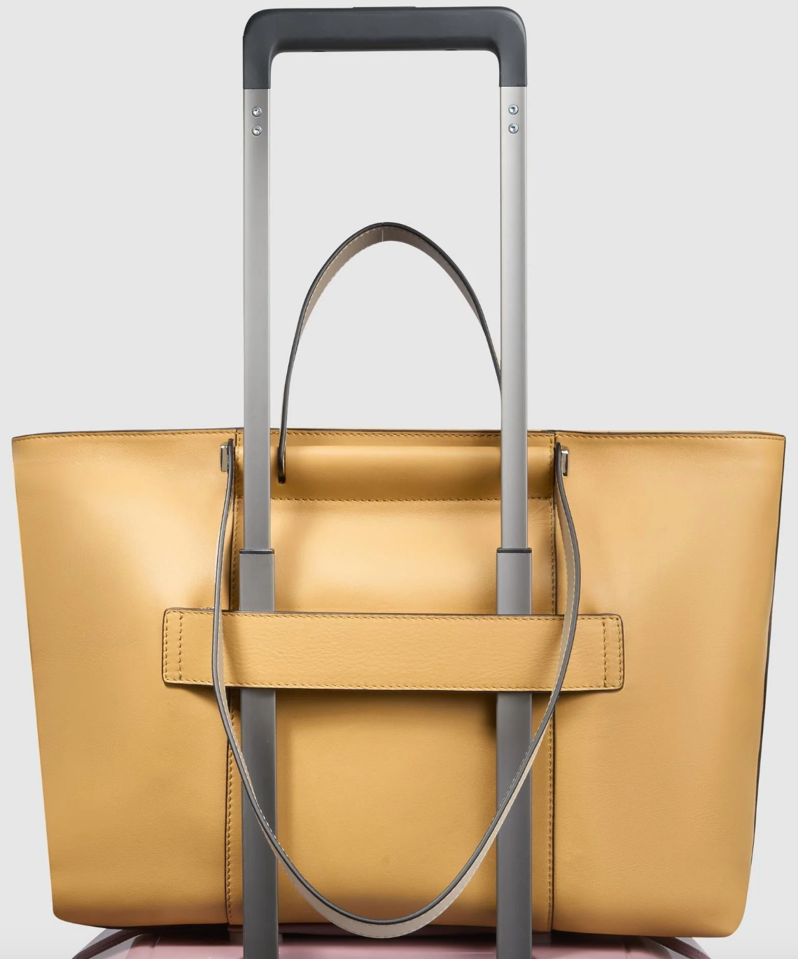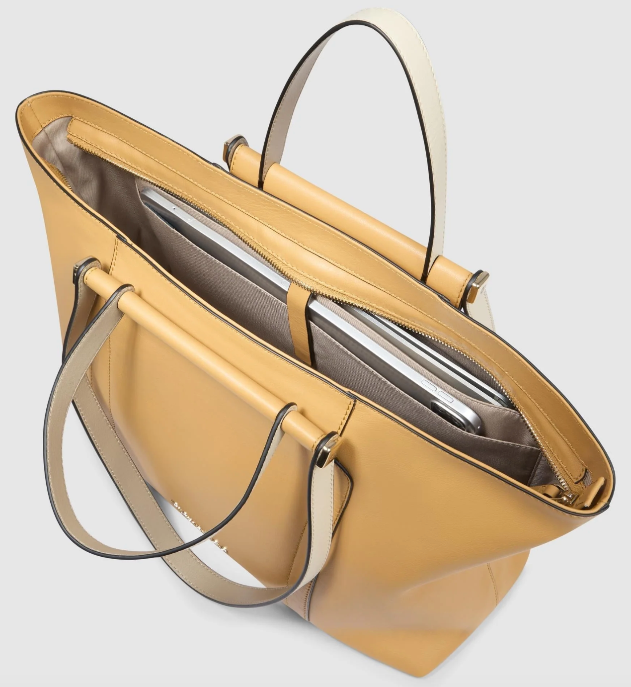 Shopping bag donna in pelle elegante, con porta PC e iPad® protetti da antiurto e RFID. Scomparto unico capiente per notebook da 14” e iPad® fino a 11”. Manici fissi, interno in poliestere e piedini in metallo per proteggere la base. Misure: 43 x 28 x 14 cm, peso di circa 1 kg. Stile e sicurezza in un accessorio versatile.