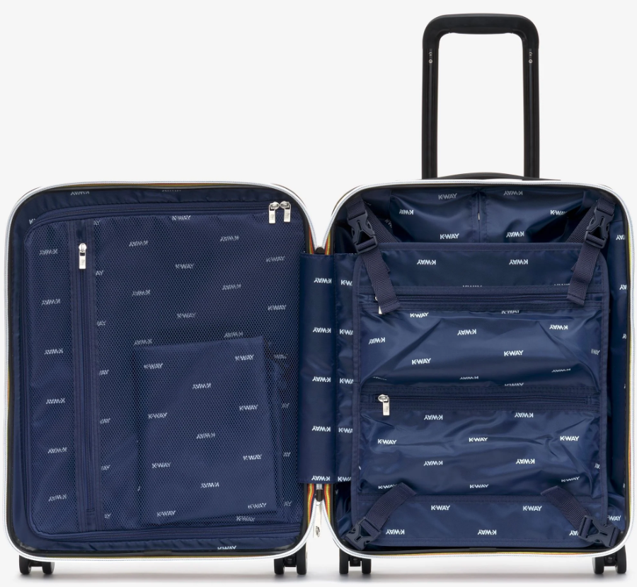 All’interno, la fodera logata K-Way, il pannello divisorio rimovibile con inserti in rete e la tasca con zip permettono di organizzare in modo ordinato tutti gli effetti personali. Completa di sacchetto portabiancheria e chiusura TSA, approvata per i controlli aeroportuali internazionali.